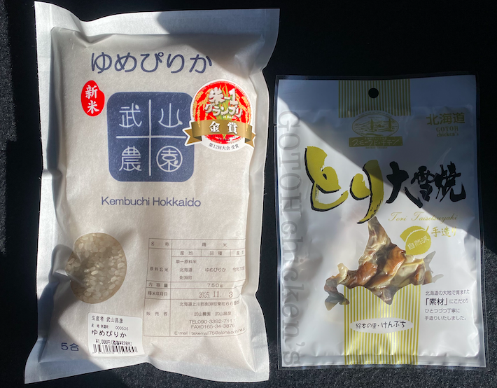 剣淵では、金賞を受賞したお米と、名物のスモークチキンをお土産に。