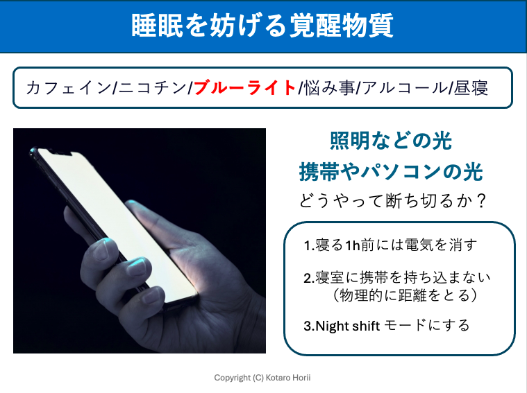 睡眠の妨げとなるもののなかで「光」は大きな影響をもつと言われています。特に現代の生活では、「部屋が明るすぎること」が睡眠の質を下げているとされています。21時以降は、少しづつ、照明の明るさを暗くすることをおすすめします。